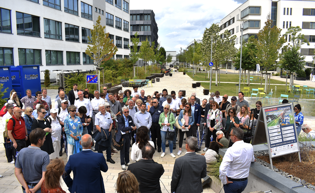 Der Spaziergang im interkommunalen Technologiepark Tübingen-Reutlingen ist seit Jahren ein beliebter Programmpunkt innerhalb der „Innovationstage“ der IHK Reutlingen, doch dieses Jahr waren so viele Teilnehmende wie noch nie dabei: Weit über 100 wissbegierige Gäste aus Wirtschaft, Wissenschaft und Kultur wollten das Neueste über die dynamische Entwicklung am Tübinger Standort erfahren. Die Gruppe startete ab 14.00 Uhr am neu gestalteten Platz bei der Sternwarte und war gute drei Stunden unterwegs. Der geführte Rundgang klang mit kühlen Drinks und Snacks im neu eröffneten Betriebsrestaurant der TTR „The Hungry Elk“ aus.