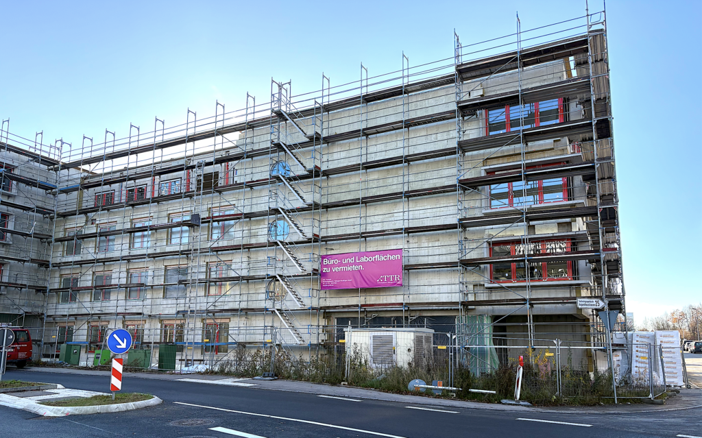 Direkt gegenüber dem NMI erstellt die TTR GmbH zeitgleich zwei aneinander angrenzende Technologiegebäude, eines zur eigenen Vermarktung, ein weiteres im Auftrag des NMI (vorne). Die Bauarbeiten an der Markwiesenstraße werden voraussichtlich im Sommer 2026 abgeschlossen sein.